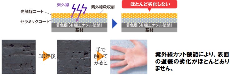 無機質のセラミックコートだから紫外線ではほとんど劣化しません。また、紫外線吸収剤により、着色層を保護しています。声㎥紫外線吸収剤は、日焼け止めクリーム等にも使用されています。