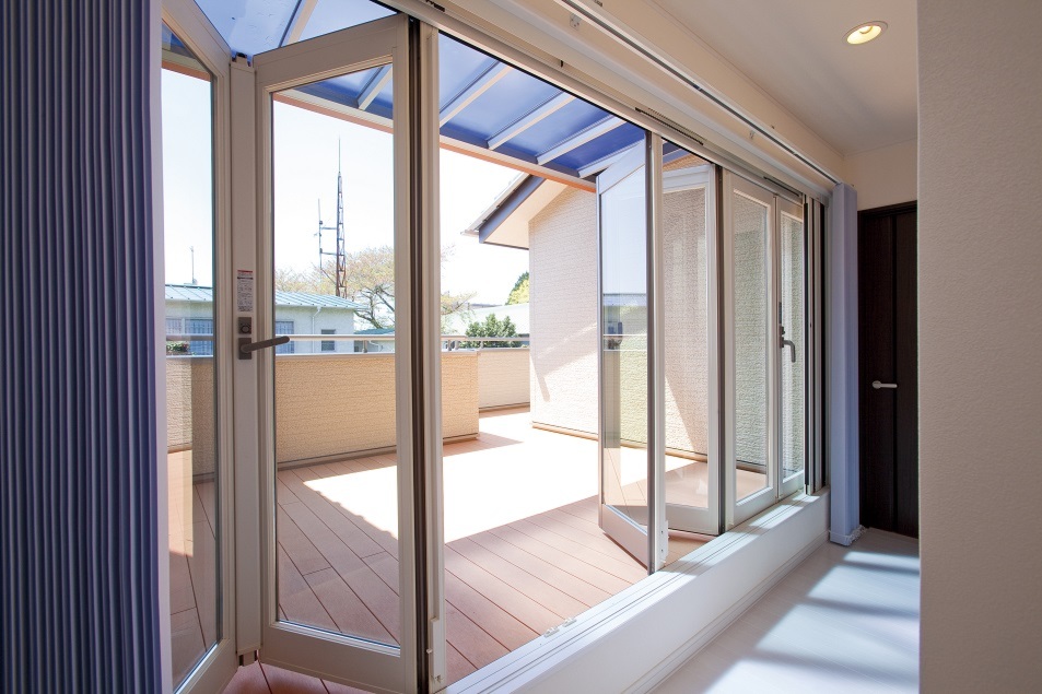 バルコニー ◇フルオープンサッシのウッドデッキ風のベランダ ◇開放的に繋がり、太陽の光の下でくつろげる憩いの場所として活躍しています ◇頑強な構造を活かした大開口を提案しました